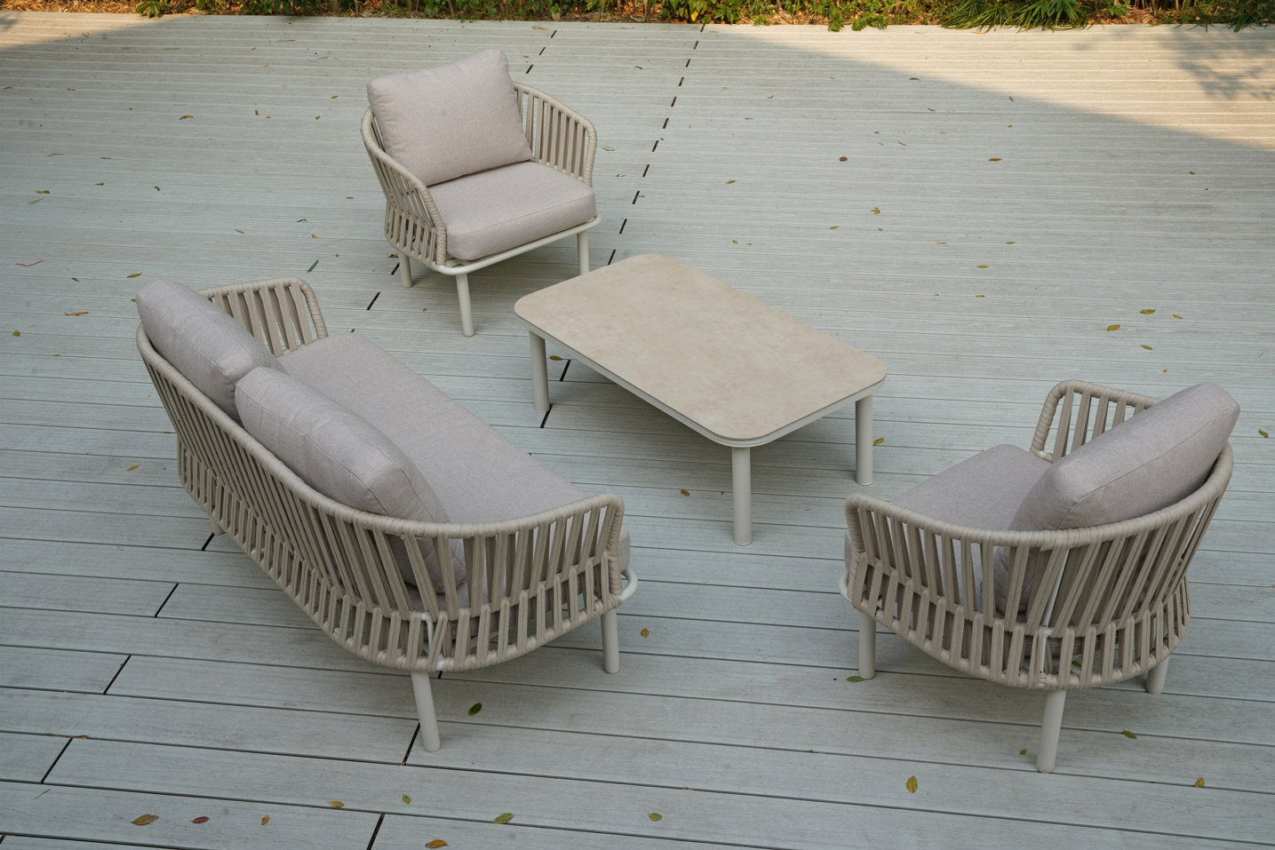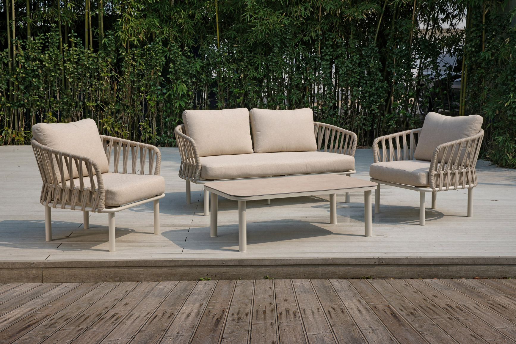 A refined 4-piece outdoor lounge set featuring twin-groove handwoven webbing across the armrests and backrests. Paired with a smooth curved aluminum frame and detachable cylindrical legs, it offers an elegant look with space-saving packaging — designed for B2B flexibility.